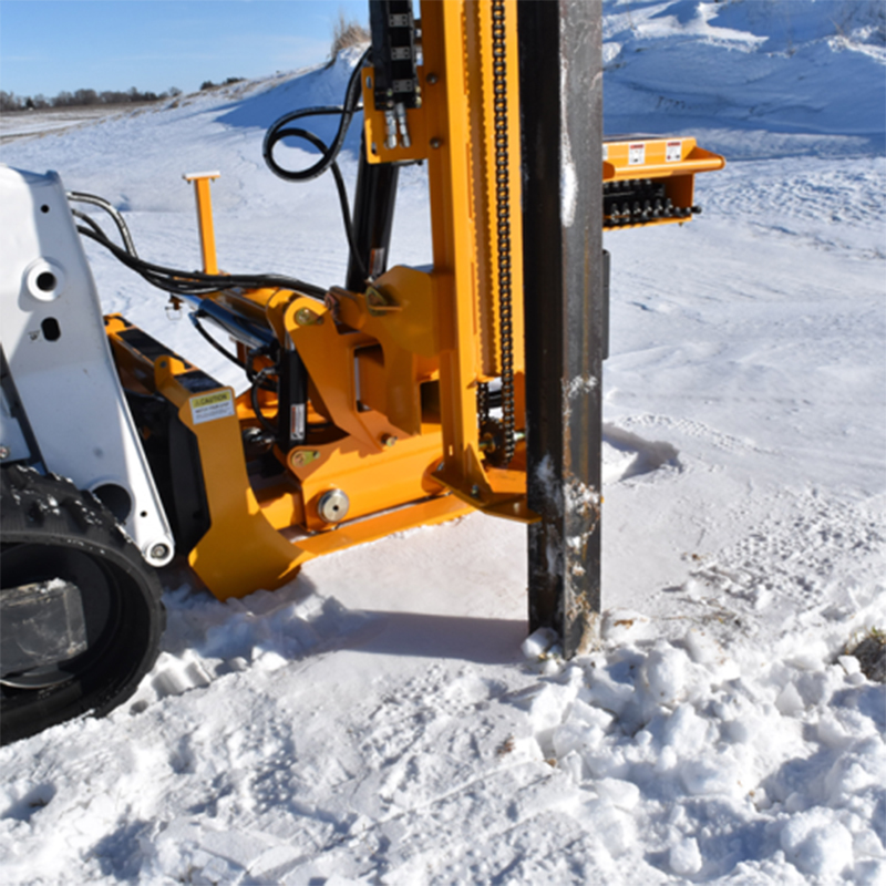 The Solar Pro Pile Driver Attachment is Omni Adjustable to ensure precise, prompt, and plumb, solar pile installations regardless of the jobsite terrain. Designed to expedite the installation of solar-panel supports (piles) utilized in ground-mounted solar projects. This professional-grade skid steer attachment is designed, built, and supported in the USA to provide shorter lead-times and unmatched product support. Its omni adjustable, powerful 800 ft. lb. (1,085 joule) hydraulic hammer safely increases jobsite productivity and profits.